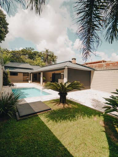 Casa contendo: -Sala de TV ou escritório (podendo ser utilizada como quarto); -Lavabo; -Sala de jantar integrada à sala de estar e à cozinha interna; -Área gourmet com banheiro; -Lavanderia; -Despensa; -Quintal espaçoso com piscina; -3 quartos, sendo 1 suíte com closet; Diferenciais do imóvel: -Garagem coberta para 2 carros; -Área gourmet completa com banheiro; -Ar-condicionado na sala e nos quartos; -Energia fotovoltaica (solar);