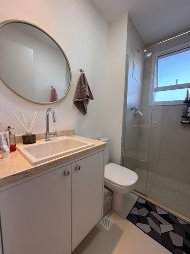 1 Banheiro suíte, 1 banheiro para os 2 quartos e 1 lavabo.