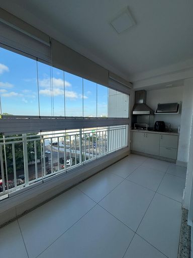 Sacada com churrasqueira e pia. Fechada com vidro blindex e cortina.